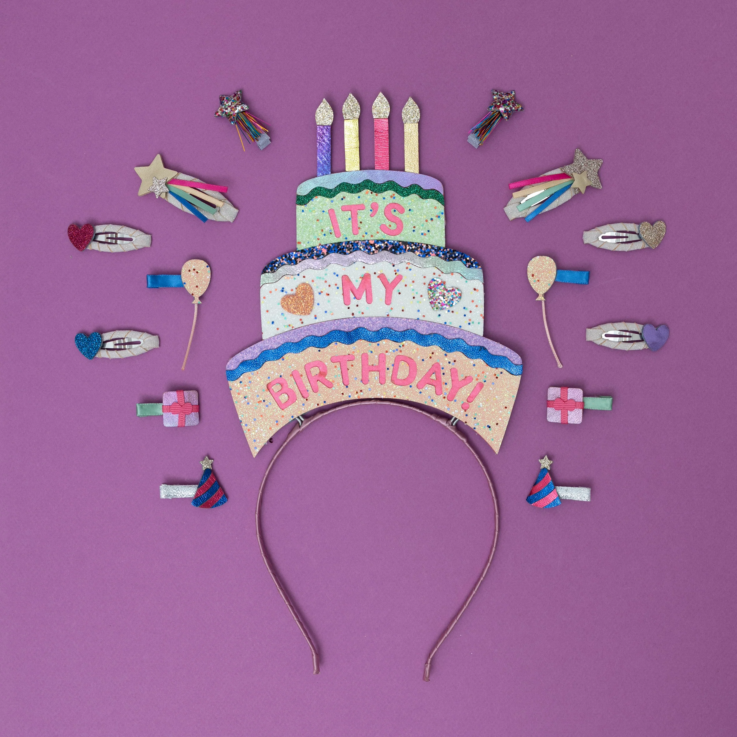 - Three 'tiers' of birthday cake crafted from fine glitter fabrics and embellished with glitter hearts and 'It's my birthday' wording in pink, all adorned with four brightly coloured metallic candles with gold glitter 'flames'